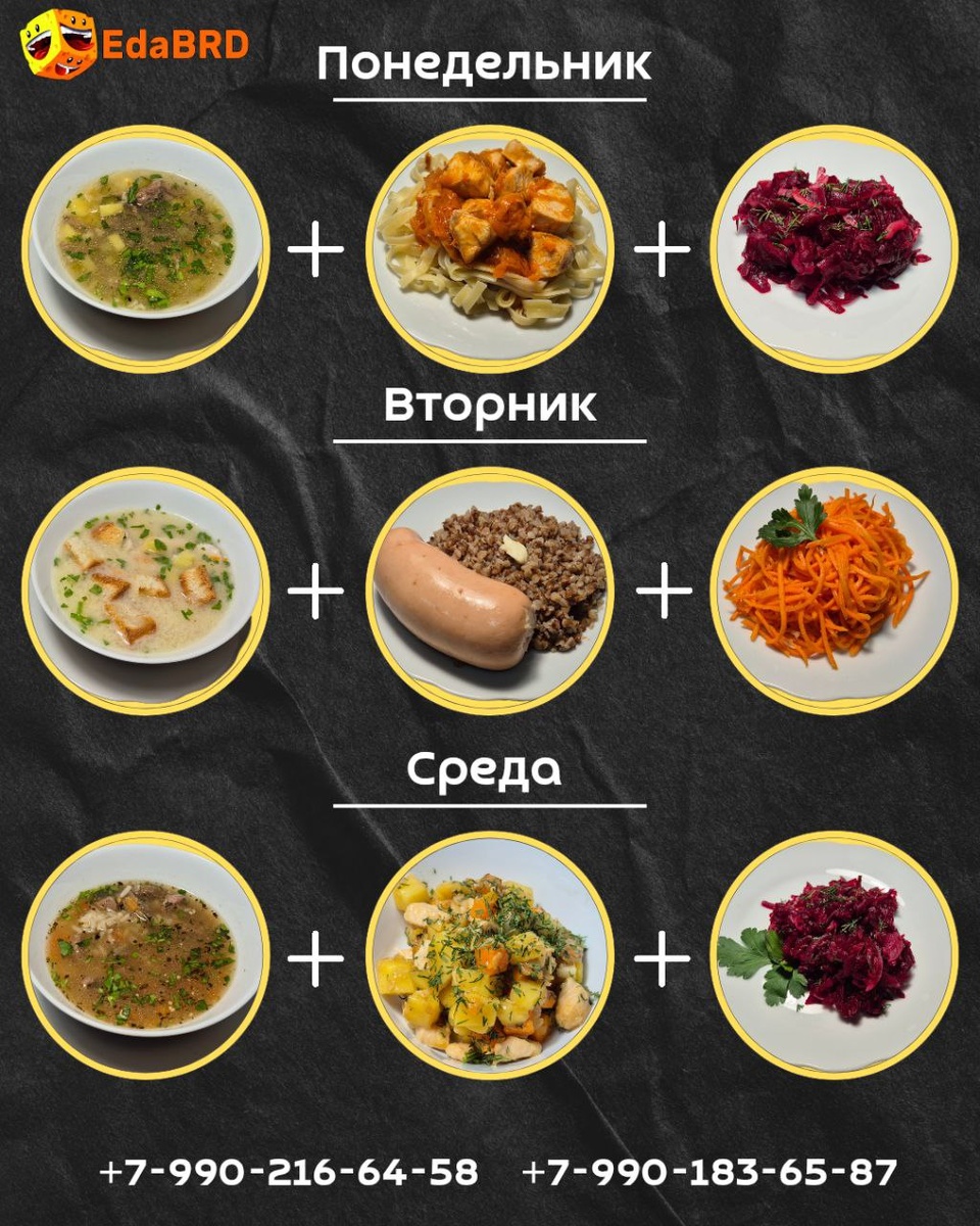 Наши комплексные обеды🍝 📕Меню на неделю 🤩🤩🤩🤩🤩🤩🤩🤩🤩🤩🤩 ❤️ПОНЕДЕЛЬНИК ❤️- 600₽ Рассольник Ленинградский Лапша с гуляшом куриным Салат свекольный ❤️ВТОРНИК ❤️- 595₽ Сырный суп с курицей и сухариками Гречка с сарделей куриной Морковь по-корейски ❤️СРЕДА❤️- 595₽ Суп харчо Жаркое куриное Салат икра свекольная ❤️ЧЕТВЕРГ❤️- 555₽ Уха Картофель отварной с куриной сосиской Салат Летний ❤️ПЯТНИЦА ❤️- от 550₽ Суп с лапшой и курицей Пюре с котлетой (на выбор) Салат Свежесть ❤️СУББОТА ❤️- 560₽ Суп Петровский с куриными фрикадельки Ленивые голубцы Салат Винегрет ❤️ВОСКРЕСЕНЬЕ ❤️- 615₽ Борщ Рис с котлетой (на выбор) Капуста квашеная КОМПЛЕКСНЫЕ ОБЕДЫ ДОСТУПНЫ С 12:00 Принимаем предзаказы к завтрашнему дню!❤️ ❤️По телефону: +7-990-216-64-58 (+7Телеком) +7-990-183-65-87 (Миртелеком) ❤️Через наш сайт: https://edabrd.uds.app ❤️Телеграм: @edabrd1