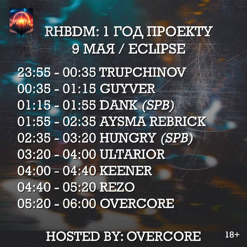 Расписание сегодняшней ночи. 😧 • Trupchinov (Colombian Gabber, Hard Techno) • Guyver (PCP Hardcore) • DANK (SPB. Oldschool, Happy Hardcore) • Aysma Rebrick (Hardcore) • Hungry (SPB. Early, Oldschool Hardcore) • Ultarior (Early Hardcore, 909 Show) • Keener (Bunker Hardcore & Terror) • Rezo (Early & New Style, Industrial Hardcore) • Overcore (190+ bpm Gabber, Early & 00' Terror) 🎫 Предпродажа билетов закрывается в 20:00, на входе будет дороже 📆 9 мая, 23:55 📍Eclipse, Переведеновский переулок, 21, стр. 11, Москва