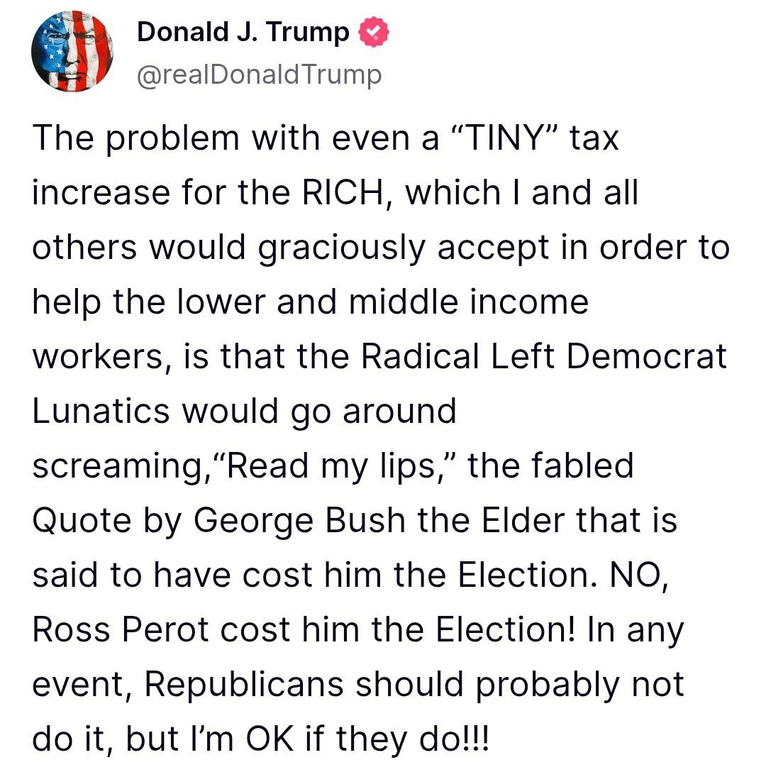 Trump says he'd 'GRACIOUSLY' accept tiny tax raise for the rich But it's not happening or he'd be handing 'Radical Left Democrat Lunatics' sound bite to use against him. 'In any event, Republicans should probably not do it'. #Trump