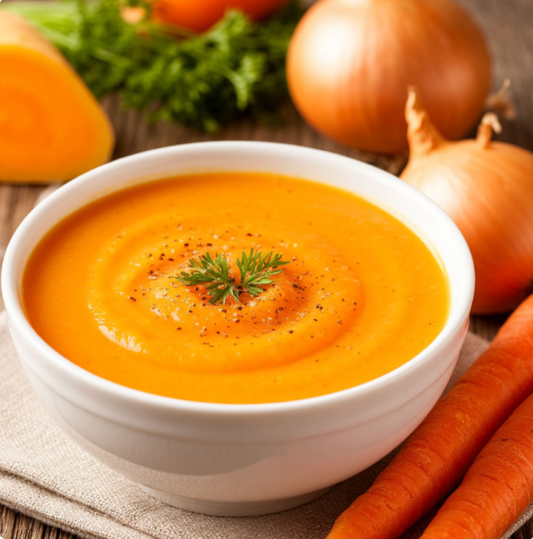 Приготовим легкий и полезный диетический суп-пюре – отличный вариант для тех, кто следит за своим питанием! Для начала подготовим овощи: две моркови тщательно моем, чистим и нарезаем небольшими кусочками. Одну репчатую луковицу очищаем и мелко нарезаем. В кастрюле разогреваем 1 чайную ложку растительного масла. Обжариваем лук до мягкости, добавляем морковь и обжариваем овощи несколько минут. Заливаем овощи 500 мл воды. Солим по вкусу (примерно 1/5 чайной ложки). Добавляем щепотку черного перца. Доводим суп до кипения, затем уменьшаем огонь и варим до мягкости моркови (около 15-20 минут). Снимаем кастрюлю с огня и пюрируем суп погружным блендером до однородной консистенции. Добавляем 125 мл молока (можно использовать обезжиренное). Тщательно перемешиваем суп. Прогреваем суп на небольшом огне, не доводя до кипения. Если суп получился слишком густым, можно добавить немного больше воды или молока. Подаем диетический суп-пюре горячим, украсив зеленью (по желанию). Этот суп-пюре получается о