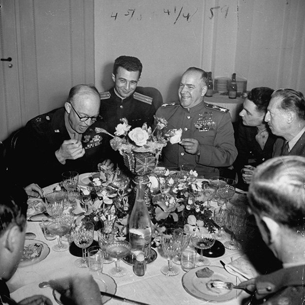 Знаменитого военачальника маршала Георгия Жукова называли маршалом Победы. Он брал Берлин, принимал капитуляцию Германии и парад на Красной площади в 1945 году. В его квартире в знаменитом маршальском доме в Романовом переулке было принято готовить, а не заказывать еду из кремлевской столовой неподалеку. По воспоминаниям дочери маршала Эры Жуковой, маршал любил борщ, гречневую кашу и котлеты. А вот на праздничных банкетах предпочитал жареного молочного поросенка, блины с икрой и фаршированного кролика. На фото Георгий Жуков за столом с президентом США Дуайтом Эйзенхауэром. @foodiscovery