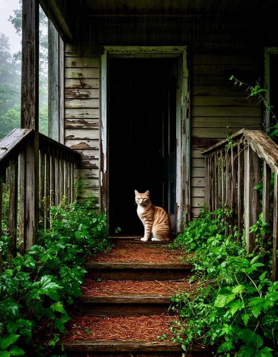 Маринка стояла перед крыльцом страшного дома, дверь которого была приоткрыта. Когда страх немного отступил, она начала потихоньку пятиться. Тихо, шаг за шагом, она отодвигалась от чёрной, пугающей пустоты, не сводя больших, внимательных глаз с приоткрытой двери. И вдруг на крыльцо из лопухов выскочил полосатый кот.