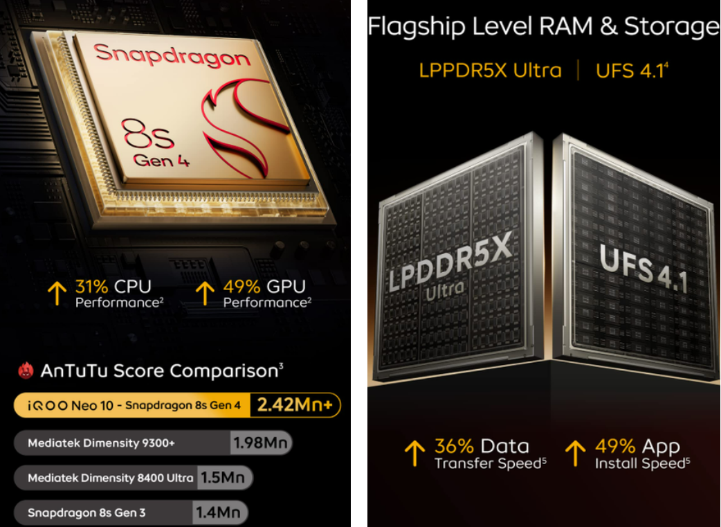 Бренд iQOO официально подтвердил, что iQOO Neo 10 дебютирует в Индии 26 мая. Это будет первый смартфон с новым чипсетом Snapdragon 8s Gen 4. Микросайт Amazon India и официальный сайт iQOO India получили обновления, раскрывая подробные характеристики будущего устройства. iQOO Neo 10 позиционируется как самый быстрый телефон в своей категории благодаря чипсету Snapdragon 8s Gen 4. Производительность центрального и графического процессоров, как утверждается, выросла на 31% и 49% соответственно по сравнению с его предшественником - Snapdragon 8s Gen 3. В тесте AnTuTu новинка набирает более 2,42 миллиона баллов, обойдя такие чипсеты, как Dimensity 9300+ и Dimensity 8400 Ultra. Чтобы показывать производительность флагманского уровня, iQOO Neo 10 будет оснащен оперативной памятью LPDDR5X и хранилищем UFS 4.1, обеспечивая более быструю передачу данных и установку приложений. Недавнее появление телефона на платформе Geekbench показало, что он также будет оснащен 12 ГБ оперативной памяти. Новый