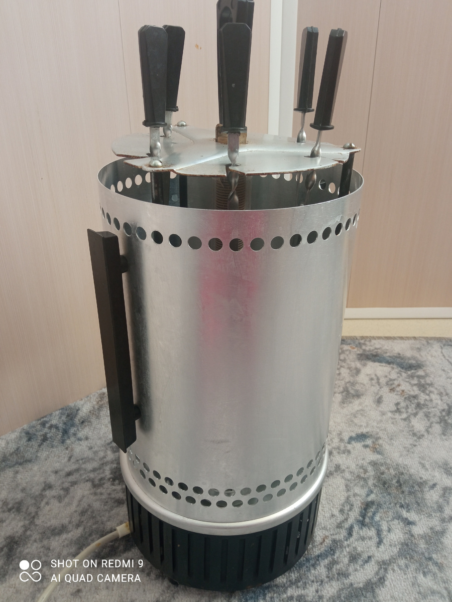1 мая, первые большие выходные. Окна вымыты до блеска, шторы/тюль выстираны, пора и сменить род деятельности) Традиционно в эти дни пол-России отправляется на шашлыки. Ну, мы, конечно, тоже решили не отставать. Тем более, что в частных домах вокруг нас народ дружно вытащил во дворы мангалы и по округе понеслись ароматы жареного мяса)))) Вот только мы живем в квартире, в высотке, и возможности насладиться отдыхом в собственном дворе у нас нет. А шашлыков хочется. И тут на помощь пришла она - электрошашлычница. Раритет производства 1986 года. Приобрел ее еще мой свекор в те давние года, и вот уже несколько лет как она перешла в наследство моему мужу. Установили ее на балконе, нанизали свининку на шампура, и процесс пошел) Получилось ничуть не хуже, чем у соседей (мысленно показываю им язык))). Ну и хочу продемонстрировать нашу помощницу. Может, у кого-то тоже есть такая, или похожая. Делитесь) Вот так она выглядит в собранном виде. Не смогла вытащить ее из пакета, пришлось фоткать в тако