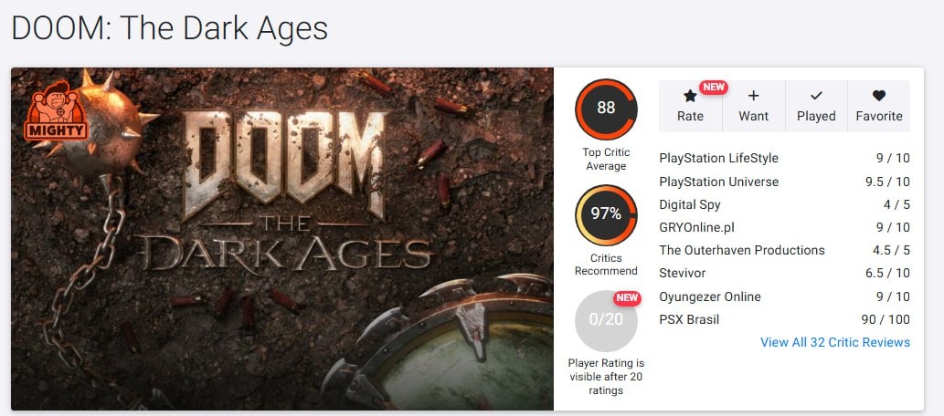 DOOM: The Dark Ages зашел критикам тайтл собрал целых 88 баллов от критиков