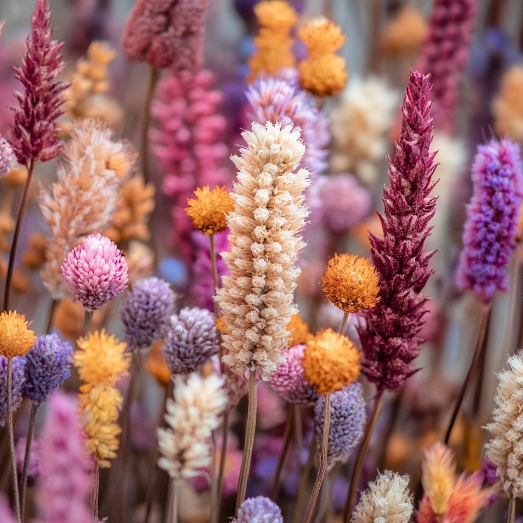 1. Статица (Limonium) — это один из самых популярных сухоцветов, известный своим разнообразием форм и цветов. Цветет с июня по сентябрь, предлагая белые, розовые, фиолетовые и желтые оттенки. Она отлично подходит для создания сухих букетов.