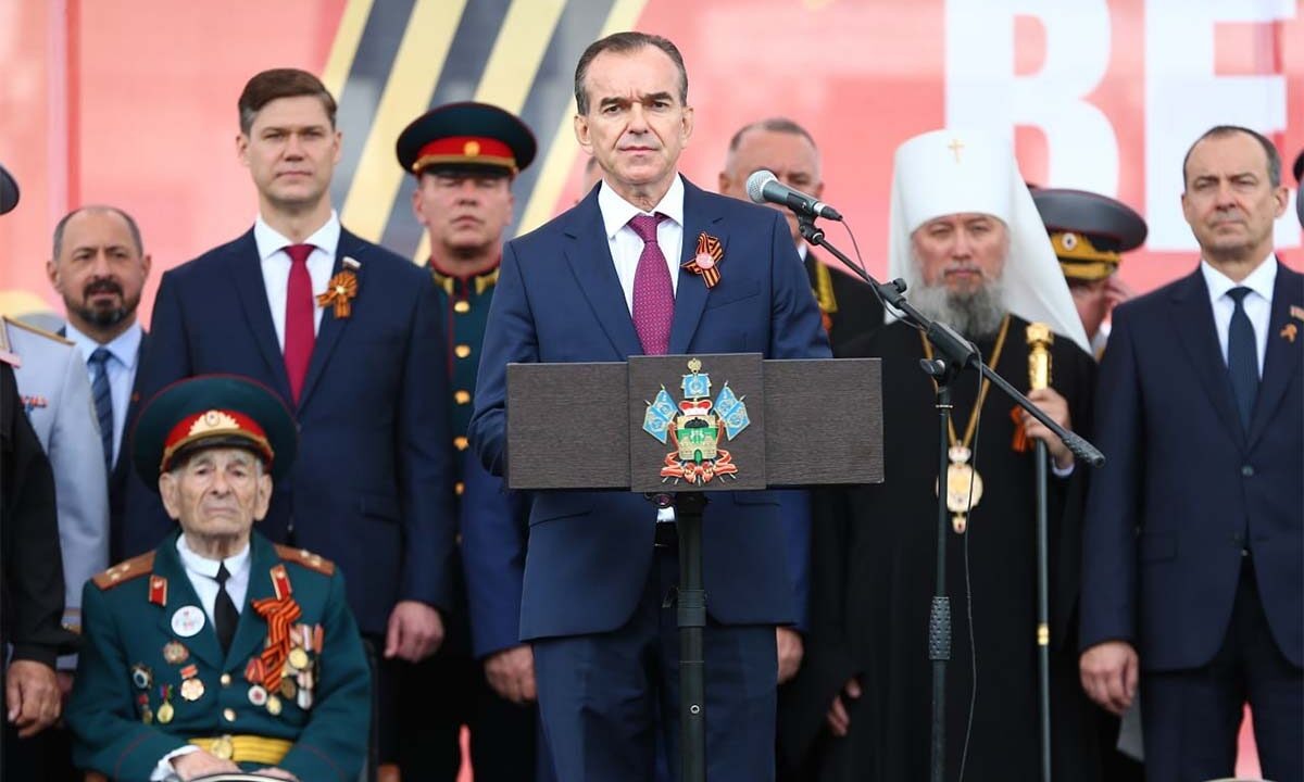 «Сражаться с немецко-фашистскими войсками ушел каждый пятый житель Кубани. С чувством глубокой ответственности за судьбу Отчизны сражались на «Малой земле» десантники отряда Цезаря Кунникова. Шли в атаку казаки под станицей Кущевской. Солдаты штурмовали «Голубую линию» в Крымском районе. Курсанты-урюпинцы ценой своих жизней остановили фашистов под Кропоткиным. Каждый город, каждая станица отважно сражались и давали отпор врагу. За мужество и героизм своих защитников, мирных жителей, Новороссийск был удостоен высокого звания «Город-герой». Анапа и Туапсе удостоились звания «Город воинской славы». Крымск, Темрюк, Армавир, Геленджик и Кропоткин гордо носят звание «Город воинской доблести». Станицы Кущевская, Шкуринская и Канеловская и Пашковская — «Рубежи воинской доблести», — отметил губернатор.