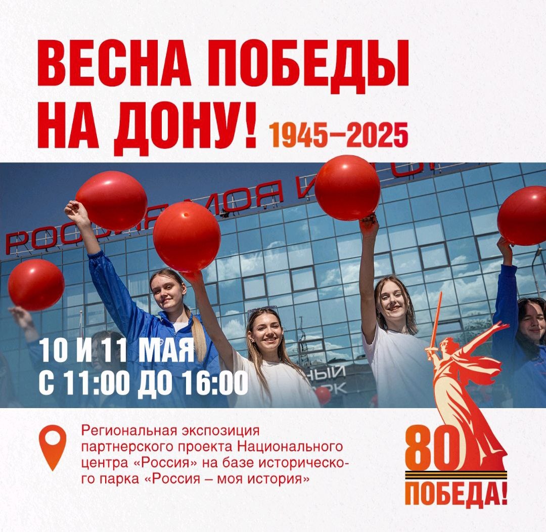 📣 В эти праздничные выходные 10 и 11 мая исторический парк «Россия – моя история» станет сердцем патриотизма и единения, собрав ростовчан и гостей города на выставке «Весна Победы на Дону», развернувшейся в рамках региональной экспозиции Национального центра «Россия». Гостей парка ждёт насыщенная и разнообразная программа, посвященная 80-летию Победы в Великой Отечественной войне. ✅ В первых залах гостей встретят выставки «Женское лицо Победы Дона» и «Ростов фронту», а на всех площадках экспозиции посетителей ждут другие интересные и полезные активности. ✅ В фойе в честь дня Победы развернётся настоящий праздник с концертной программой, театральными зарисовками, живой музыкой и ожившими мозаиками из ростовских переходов, где рассказано о героическом подвиге советского народа в борьбе с фашизмом. ✅ Для желающих подкрепиться с 12.00 до 13.00 часов у парковки перед парком «Россия – моя история» запланирована работа полевой кухней, где гостей ждёт угощение настоящей солдатской кашей с