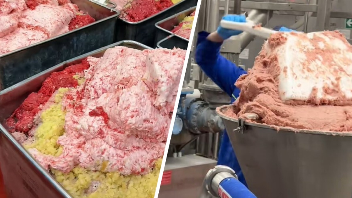 На первом видео блогер показал, как работник в перчатках лопатой загружал мясную массу в оборудование. А на втором продемонстрировал, как уже готовые мясные подушечки ехали на производственной ленте, а потом их упаковывали.