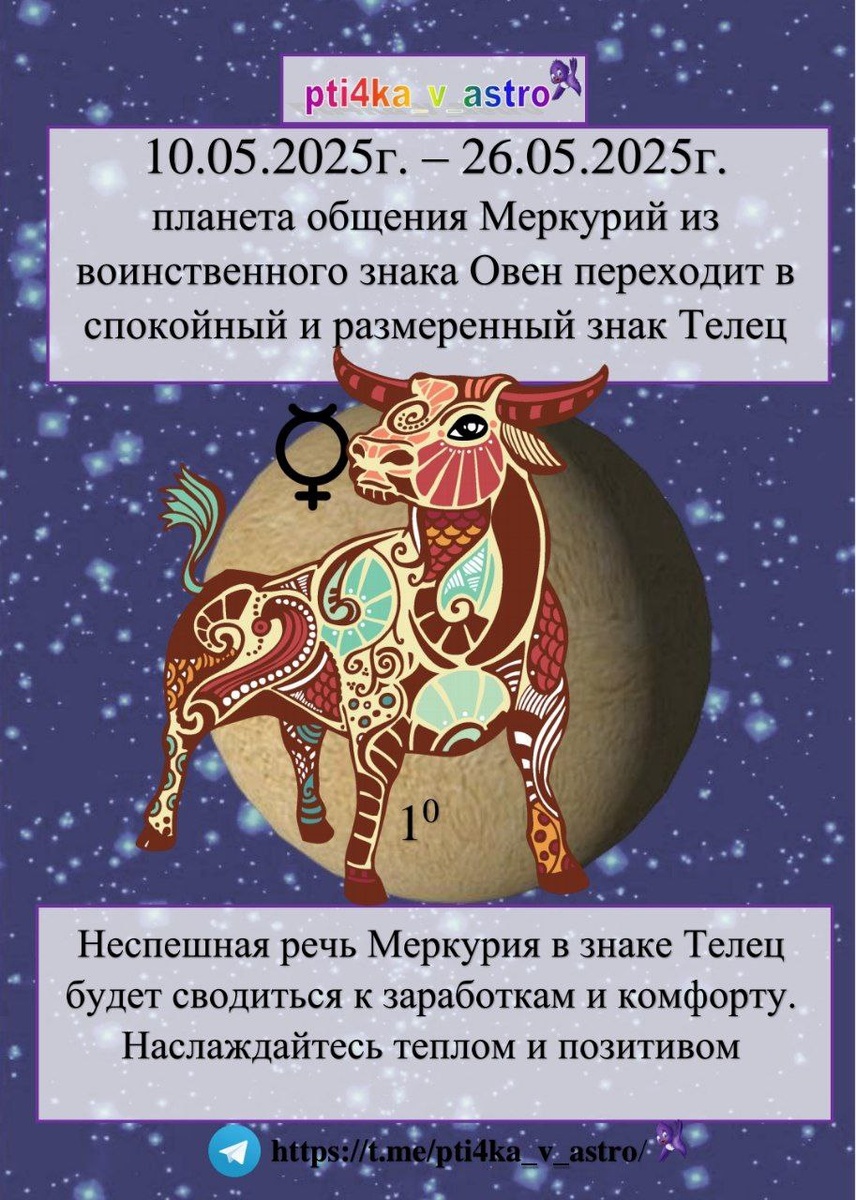💐 Размеренная речь с 10.05.2025г. 15:15 мск по 26.05.2025г. 03:59 мск 🤝 Меркурий - планета интеллекта и договорённостей, заходит в комфортный, уютный и стабильный знак Телец ♉ 🛋️ Телец - знак комфорта и выгоды ☀️ Появится прекрасное время направить все свои силы на проявленность 💃 и взять с этого выгоду💰 Стоит заметить, что Солнце также продолжает движение по материальному и комфортному знаку ♉ ‼️ Настало время сфокусироваться на заработках, пересмотреть финансовую документацию, обучающие материалы, 📋 перейти к планированию своего бюджета или заключению договоров на новый срок и выгодных условиях 🦋 Стоит избавиться от ненужного, что привносит дискомфорт в вашу жизнь 🌕 Важно сделать на днях - Полнолуние позволит убрать старые сценарии и посмотреть на мир, жизнь по-другому Не упустите шанс изменить свою жизнь! 📝 Приглашаю на личную консультацию, где с помощью МАК и красок построим новую жизнь 🎨 🔥 До 15.05.2025 действует спец. цена Подробнее в ЛС #астрология #плане