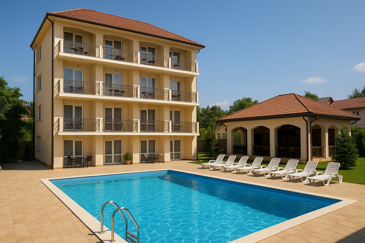 Отель предлагает 12 комфортных номеров различных категорий от двухместных до семейных люксов с балконами. Каждый номер оснащен кондиционером, телевизором, холодильником и всеми необходимыми удобствами. Ухоженная территория утопает в цветах и зелени, здесь работает подогреваемый бассейн с детской секцией, ресторан с домашней кухней, детская площадка с батутом и игровой зоной. Гости особенно отмечают заботливое отношение хозяина Артура, чистоту номеров и отличную организацию отдыха для семей с детьми.