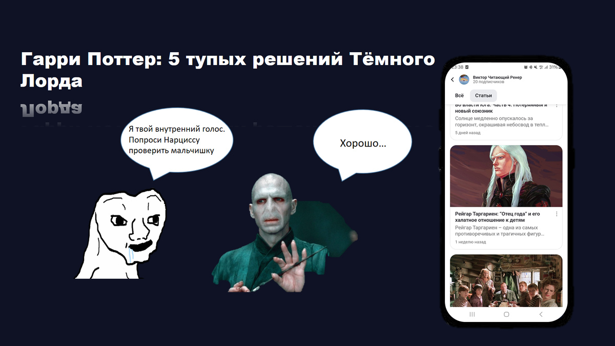 Волан-де-морт даже не попытался исхитриться и показать своё обаяние, при помощи которого он множества раз добивался того, чего хотел, чтоб попробовать навязать свою политику. Он сразу начал с того, что начал убирать неугодных, тем самым даже не попробовал поселить зерно сомнений в тех, кто может пойти против него: а вдруг Волан-де-морт прав? В 5 части Гарри заманили тем, что якобы захватили Сириуса Блэка. И Тёмный лорд сам подмечал, что мальчишка слаб из-за своей доброты. Так почему он бол