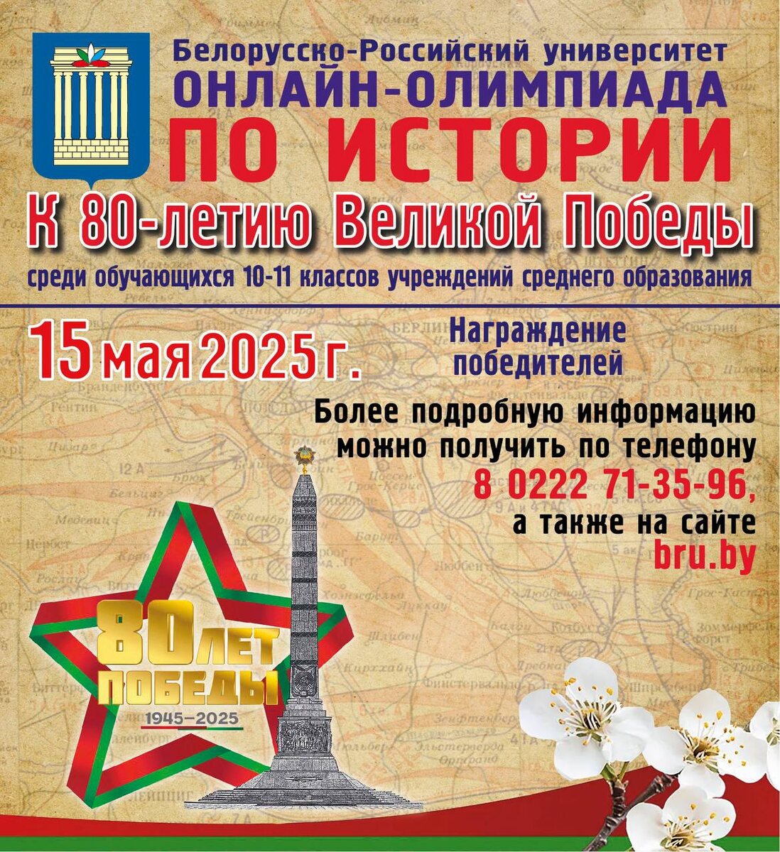 🏆 ПОБЕДИТЕЛИ ОЛИМПИАДЫ ПО ИСТОРИИ 🏛️ 6 мая 2025 года в Белорусско-Российском университете прошла олимпиада по истории "К 80-летию Великой Победы". 🎉 Поздравляем наших победителей! ✅ Награждение состоится 15 мая 2025 года в 15:00 в аудитории 308 корпуса 1 по адресу: Могилев, пр-т Мира, 43. 💪 Список победителей и призеров олимпиады: Позднякова София — ГУО «Средняя школа №45 г. Могилева» Василькова Анастасия — ГУО «Средняя школа №45 г. Могилева» Автушенко Софья — ГУО «Средняя школа №45 г. Могилева» Кривошеина Элизабет — ГУО «Средняя школа №45 г. Могилева» Марченко Диана — ГУО «Средняя школа №15 г. Могилева» Комарова Елена — ГУО «Средняя школа №45 г. Могилева» Терехова Ксения — ГУО «Средняя школа №15 г. Могилева» Кожина Ксения — ГУО «Веремейская средняя школа» Веренич Валерия — ГУО «Средняя школа №15 г. Могилева» Земляков Иван — ГУО «Средняя школа №45 г. Могилева» 🎊 Ждем вас на награждении! 🖥 Подписывайся на наши соцсети: 💬VK / 📹YouTube / 📺RuTube / 🌐 Instagram / 🎵TikTok