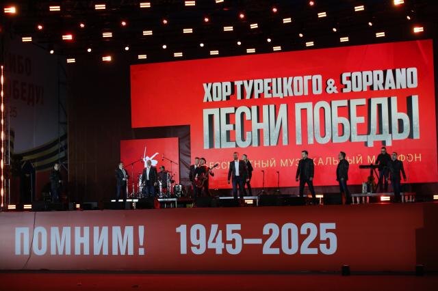«Хор Турецкого» и вокальная группа «СопраноТурецкого» 9 мая стали главными участниками большого праздничного концерта. Марафон выступлений начали волгоградские творческие коллективы, которые после передали сцену перед центральной лестницей столичным коллегам. Артисты Михаила Турецкого в течение двух часов держали внимание тысяч зрителей песнями, посвященными Великой Отечественной войне: людской хор вторил профессиональному, когда звучали «Смуглянка», «Темная ночь», «Катюша», «Синий платочек». Зрители замерли в ожидании главного музыкального символа – «Дня Победы»: под звуки марша должен был грянуть салют.