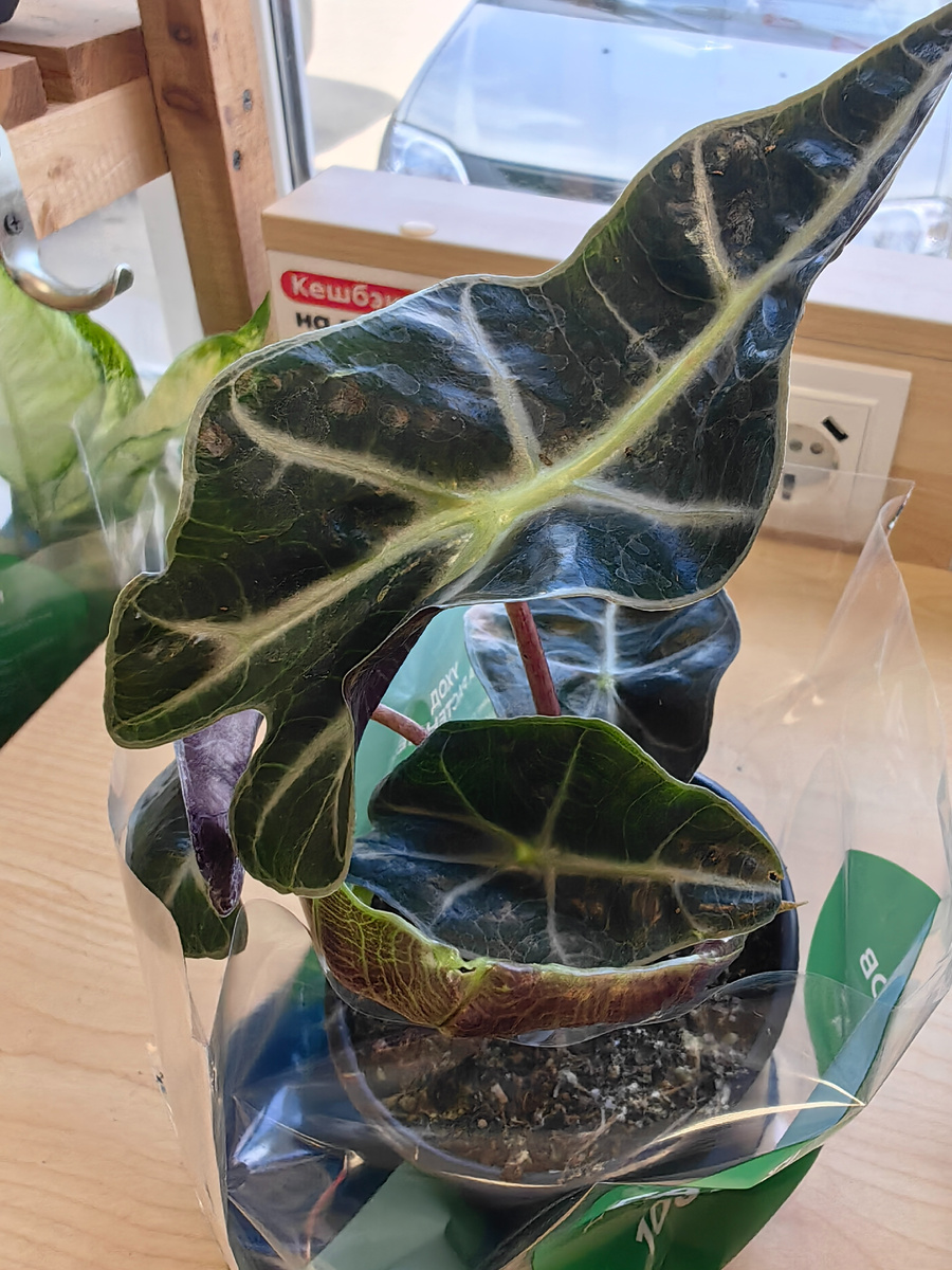 Я совсем не слежу за цветочной модой, но смотрю кучу разных блогеров, которые показывают в основном алоказии, хойи и антуриумы. Из этого я делаю вывод, что нынче мода на эти растения. Модные тренды меня никак не интересуют, а все растения я покупаю в основном спонтанно и потому что они мне нравятся. Из алоказий мне симпатична была только Полли. Но не так чтобы купить, а просто полюбоваться у кого-то. И вот, при обходе продуктовых 8 мая я увидела в новом завозе цветов в нашей деревенской Пятерочке алоказии Полли или какой-то сходный сорт. Ну, это просто судьба, подумала я))) И купила таки одну алоказию на пробу. А с учетом того, что 8 мая мы забирали кучу коробок с растениями и горшками, эта покупочка дополнила праздник цветочного хомяка)))) Дома я ее осмотрела и подобрала ей кашпо - горшочек из Фикс-прайса. Ее технический горшочек аккурат в него входил, так что я решила заменить землю и посадить ее обратно в ее же горшок. Грунт был достаточно рыхлым, но очень влагоемким. Кстати, нашла