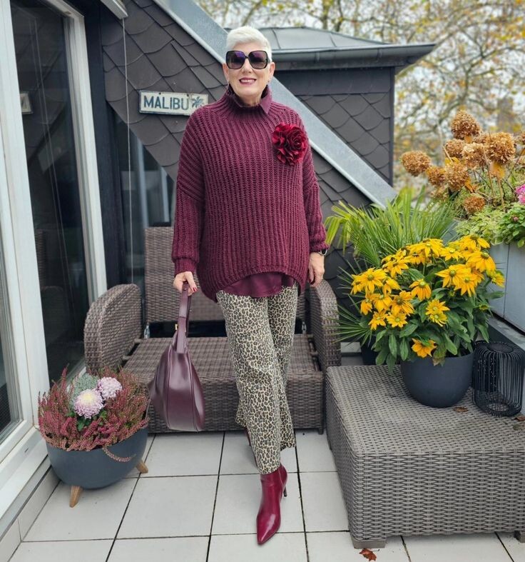 - Легкие и свободно сидящие брюки с леопардовым принтом подойдут для дам любой комплекции. Дополнить их стоит бордовой рубашкой оверсайз, свитером объемной вязки такой же расцветки (можно украсить его пышным искусственным цветком), а также яркими полусапожками и сумкой сливового оттенка.