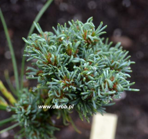 На фоне других растений хорошо видна его оригинальная голубоватая окраска, а также фирменная короткая хвойка крючком. Ну и конечно микроскопический размер.