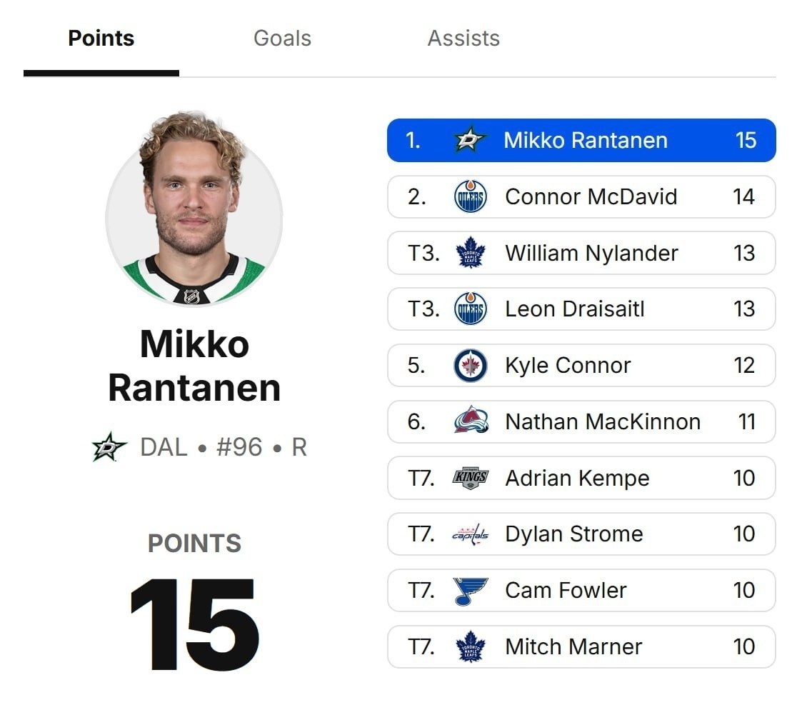 📊 Лучшие бомбардиры текущего розыгрыша Кубка Стэнли: 1. ⭐ М. Рантанен — 15 (8+7) 2. 🛢 К. Макдэвид — 14 (2+12) 3. 🍁 В. Нюландер — 13 (6+7) 3. 🛢 Л. Драйзайтль — 13 (5+8) 5. ✈️ К. Коннор — 12 (4+8) 6. ⛰️ Н. Маккиннон — 11 (7+4) 7. 👑 А. Кемпе — 10 (4+6) 7. 🦅 Д. Строум — 10 (2+8) 7. 🎵 К. Фаулер — 10 (2+8) 7. 🍁 М. Марнер — 10 (2+8)