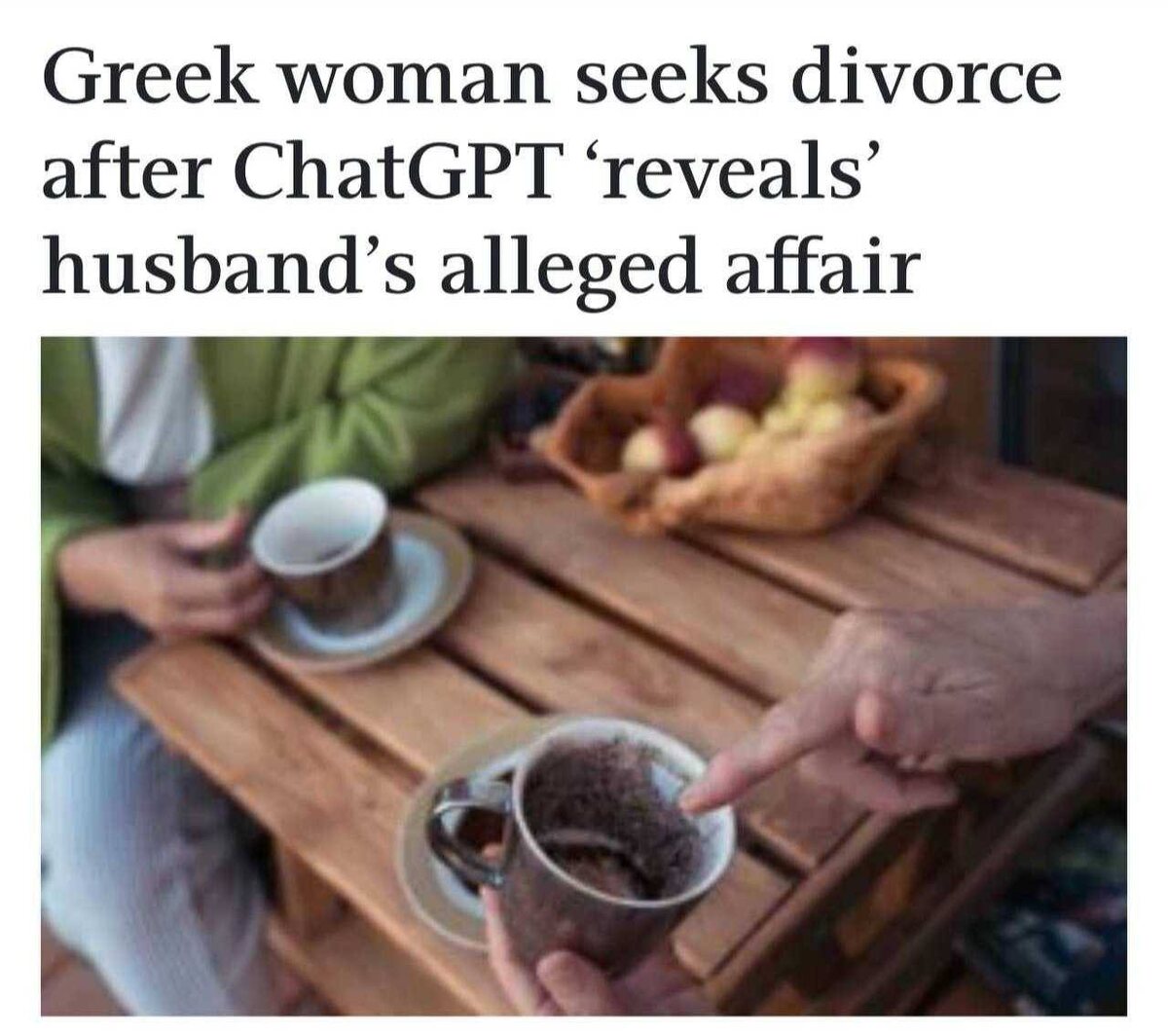 Гречанка развелась с мужем после кофе с ChatGPT. Вместо гадалки — ИИ. Она показала боту фото кофейной гущи, а тот сходу выдал: муж изменяет и влюблён по уши. В бонус — описание любовницы. 12 лет брака сдуло, как пенку с фраппе. Женщина подала на развод, даже не спросив "а ты точно?". Развод по команде: «Отвечаю, он тебе изменяет».