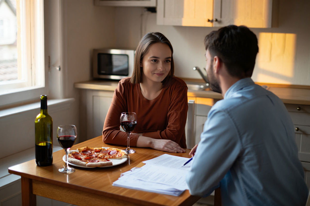 Звонок в дверь прервал мои мысли. На пороге стоял Кирилл с бутылкой вина и пиццей: