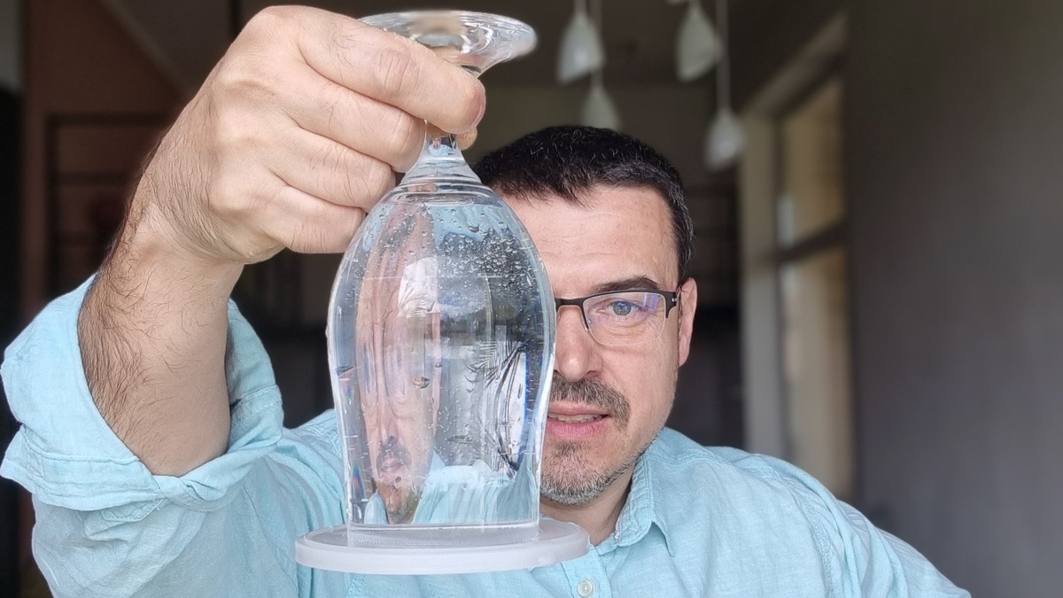 Берём обычный стакан, бокал, рюмку. Наливаем воду доверху (можно чтоб даже чуть выступало), кладём сверху плотную карточку (крышку от банки для кофе). Придерживая крышку аккуратно переворачиваем. И — опа! — крышка остаётся на месте, а вода не выливается. Как такое возможно?