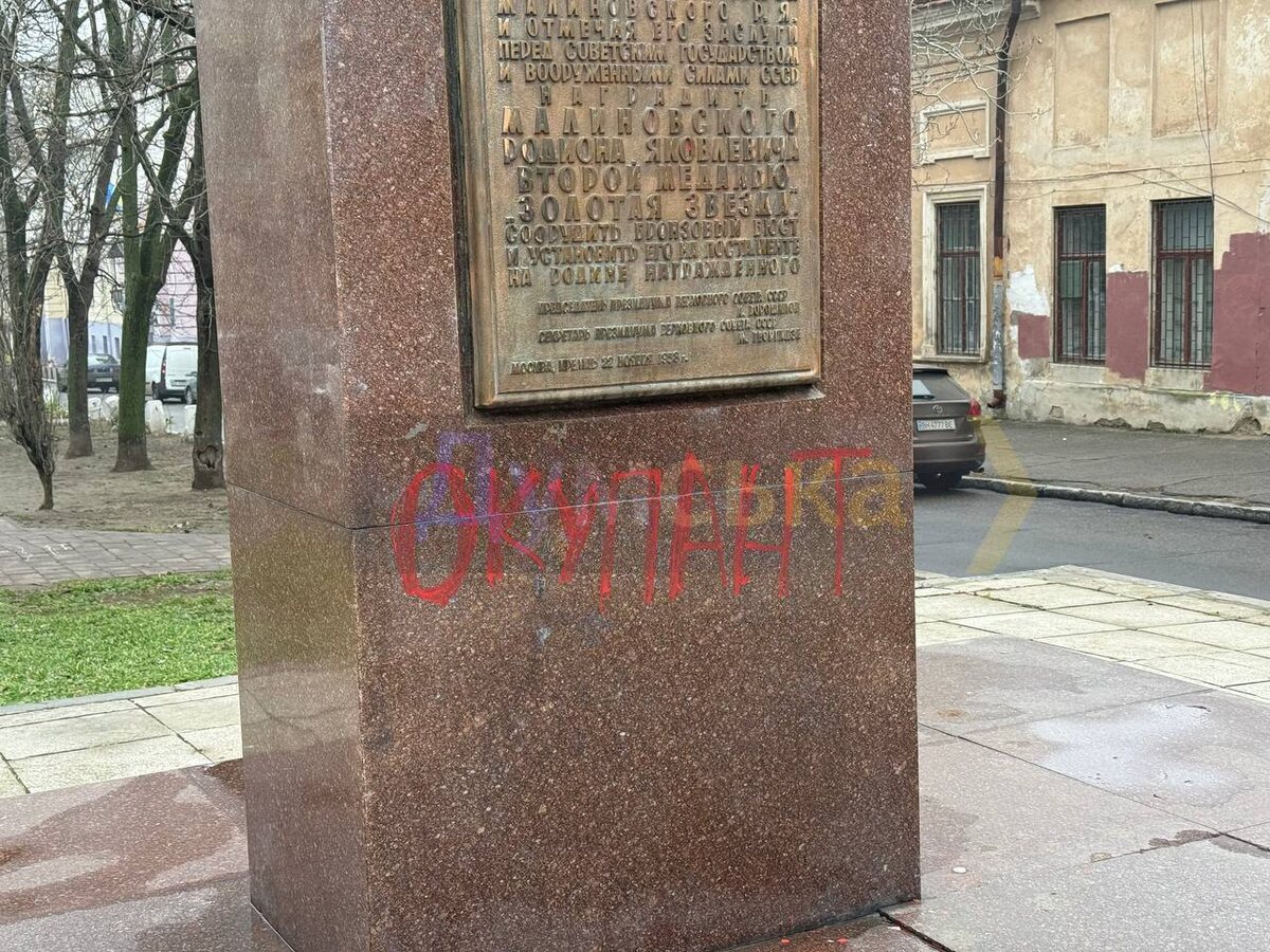 Подгадали, готовились, ночью перед 9 Мая нацисты из мовной зондеркоманды «Робимо вам нерви» изуродовали памятник Маршалу Малиновскому. Они выкорчевали монтировками мемориальную доску под бюстом полководца и похвастали в соцсетях: «Продолжаем дело Демьяна». Именно эти мовные гестаповцы сливали застреленному Ганулу информацию о людях говорящих по-русски, которых тот потом избивал, унижал, насиловал и сдавал в ТЦК. А на выкорчеванной с памятника табличке было написано то, что пришлым недобиткам не пережить. Во-первых, легендарный Маршал Советского Союза Родион Малиновский — одессит. Был министром обороны СССР. Участвовал в разгроме немецко-фашистских войск под Сталинградом. В 1943 году в должности командующего Юго-Западным фронтом провел ряд успешных операций по освобождению Донбасса и Юга Украины. В апреле 1944 года, командуя 3-м Украинским фронтом, освобождал от фашистских оккупантов родную Одессу. Получил высший военный орден СССР — орден Победы, ему было присвоено звание Героя Советск