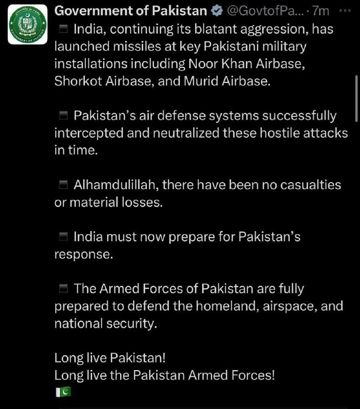 В ответ на пост Pakistan’s Government OFFICIALLY warns of retaliation in post on X ‘India must now prepare for Pakistan’s response’ Claims ‘KEY Pakistani military installations’ attacked