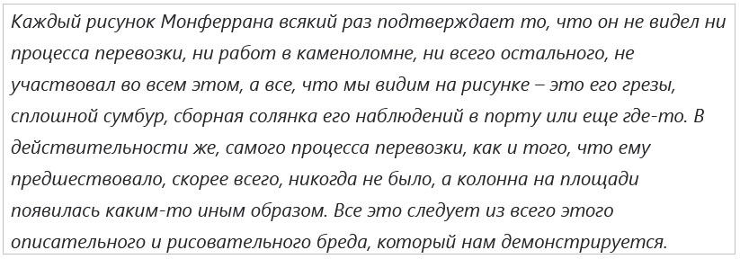 Итак, повествование Васина перешагнуло рубеж доставки колонны по Финскому заливу, но "вцепилось" в операцию выгрузки, вновь попеняв Монферрану за его "картинки". С них и продолжу разбор залётов.