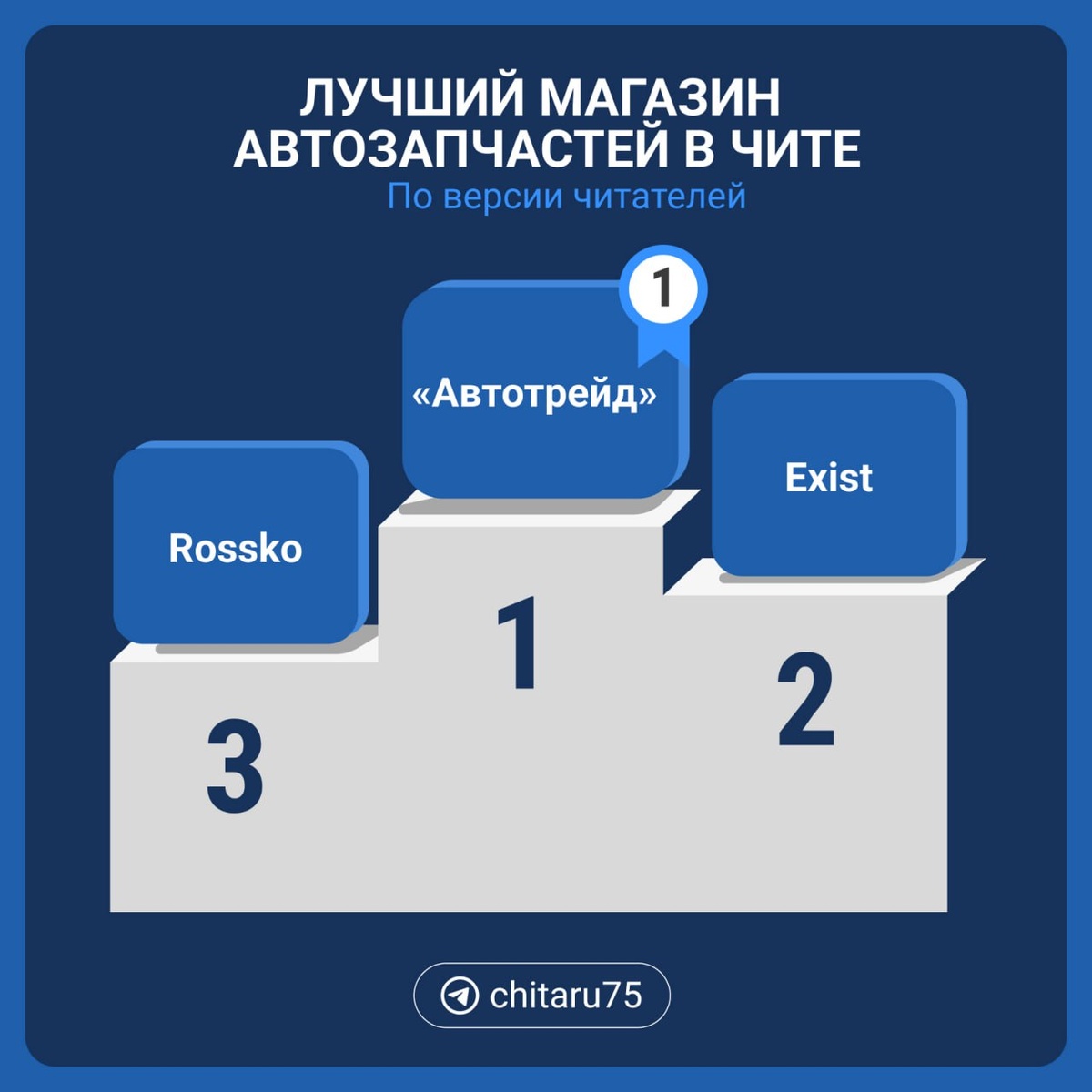 В ответ на пост Читинцы выбрали лучший магазин автозапчастей — магазин «Автотрейд». Всего в опросе @chita.ru участвовали 1090 человек — половина из них отдала голос за «Автотрейд». На втором месте магазин Exist с 17% голосов, а на третьем — Rossko (12%). В комментариях один из подписчиков рассказал, что знает мало мест в городе, где можно купить что-то в наличии, и чаще всего выход — заказывать запчасти онлайн. 🟦 Подписаться