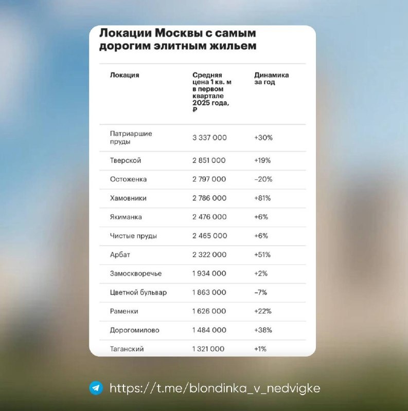 Недавно мы выяснили, что Москва попала в топ-5 городов мира с самой дорогой элитной недвижимостью. Но знаете, где именно в столице рождаются эти цифры с шестью нулями за квадрат? Вот топ-5 районов, где один «квадрат» в элитной новостройке стоит, как студия — а то и однушка — в Подмосковье: ❗️Патриаршие пруды — лидируют в рейтинге самых дорогих локаций Москвы. Средняя цена 1 кв. м: 3,33 млн ₽. ❗️Тверской район — второе место, 2,85 млн ₽/м². ❗️Остоженка — на третьем месте, 2,79 млн ₽/м². ❗️На четвёртом и пятом — Хамовники и Якиманка соответственно. Почему именно эти районы? Кто там покупает? И стоит ли вам уже сейчас смотреть в сторону премиум и элит? ______ 📱Приходите на бесплатную консультацию. Там расскажем, что стоит за ценами, как найти выгодные варианты и не переплатить за статус.