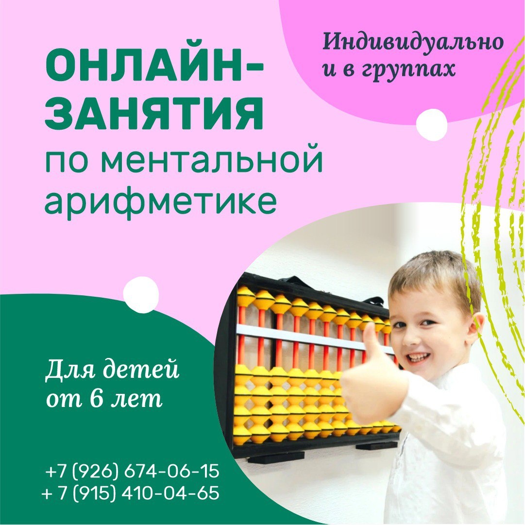 ✨ ⚡Ментальная Арифметика ОНЛАЙН (для детей от 6-ти лет). ☝️Преимущества Ментальной Арифметики: 📌Развитие обоих полушарий мозга. 📌Улучшение концентрации внимания и памяти. 📌Развитие скорости мышления. 📌Повышение уверенности в себе. 👉🏻Дети, занимающиеся Ментальной Арифметикой, показывают отличные результаты не только в математике, но и в других предметах.☺️ Они лучше усваивают информацию, быстрее решают задачи и уверены в себе. Ментальная арифметика – это будущее вашего ребенка!💫 🚫 Возраст: 6+ 🏢 Учебный центр "Сферио" 📍 г. Чехов,ул. Полиграфистов, 6 (Вход со двора, подъезд 2, этаж 3) 🔗 Записаться: https://wa.me/+79154100465 Наши соцсети 📲⬇️ ➡️ ВК https://vk.com/sferio_kids ➡️ Продленка https://vk.com/prodlenkachehov ➡️ Школа https://vk.com/sferio_school #webСферио ✅ Мероприятия Чехов https://dzen.ru/id/66cc4b48e9ef144699238a51 http://vk.com/chekhov_events http://dzen.ru/chekhov_events