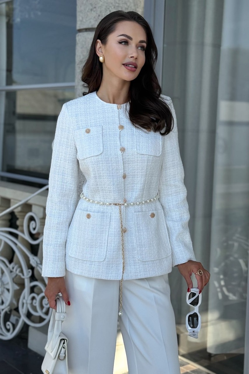💎 Белоснежная элегантность, которая восхищает с первого взгляда! ⠀ Идеальный твидовый жакет в роскошном белом оттенке — выбор уверенных в себе женщин, которые ценят качество, стиль и комфорт. ⠀ Элегантный прямой крой, изысканные золотистые пуговицы и дизайнерский пояс с жемчужными деталями подчеркивают талию и добавляют образу нотку утончённой женственности. ⠀ Этот жакет легко впишется в деловой, праздничный и повседневный гардероб. Стильно смотрится с брюками, юбками и даже джинсами — ваш образ будет безупречным в любой ситуации! ⠀ ✨ Размеры: 42–52 ✨ Идеален для деловых женщин ✨ Стиль: деловой, элегантный, женственный ⠀ Станьте воплощением современной классики 🤍