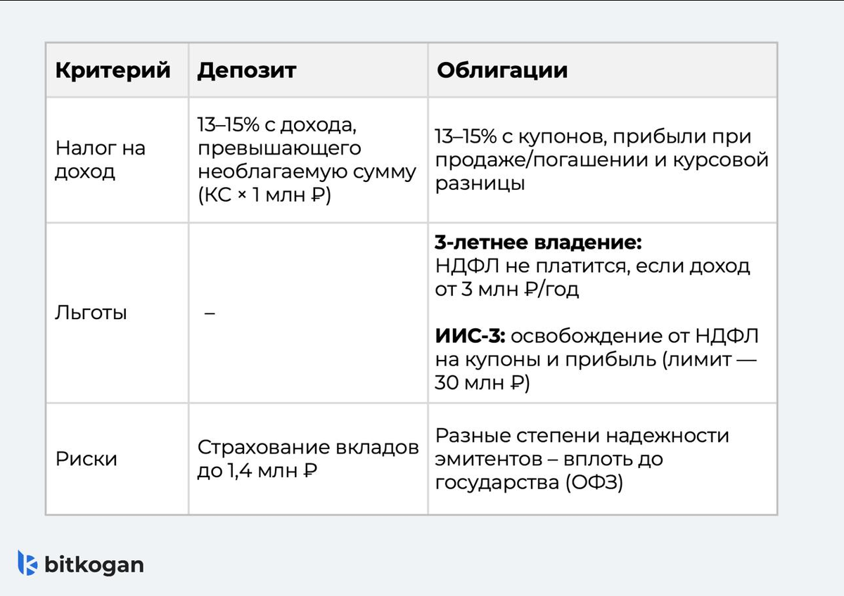 Ставка ЦБ, скорее всего, на пике. И все бросились фиксировать доходность. Депозиты дают неплохой процент, по облигациям тоже есть интересные варианты. Например, бумаги «Атомэнергопрома» дают около 18% годовых на ближайшие 5 лет. Но как насчёт налогов? Не окажутся ли здесь облигации в проигрыше? В случае депозитов налог начисляется не на весь доход, а только на сумму, превышающую необлагаемый минимум (максимальная ключевая ставка ЦБ на начало месяца × 1 млн ₽). Например, если ставка составляет 16%, то с дохода до 160 тыс. руб. не нужно платить налог. Всё, что выше — облагается НДФЛ: ➡️ 13% — если общий доход за год до 2,4 млн ₽ ➡️ 15% — если доход превышает 2,4 млн ₽ В облигациях налог берётся с купонного дохода (по корпоративным и госбумагам), а также прибыли при продаже или погашении (если цена выше покупки). Если это замещающие облигации в валюте, и курс на момент продажи выше курса покупки — придётся платить налог с валютной переоценки. Зато есть и налоговые льготы: ▫️Льгота за в
