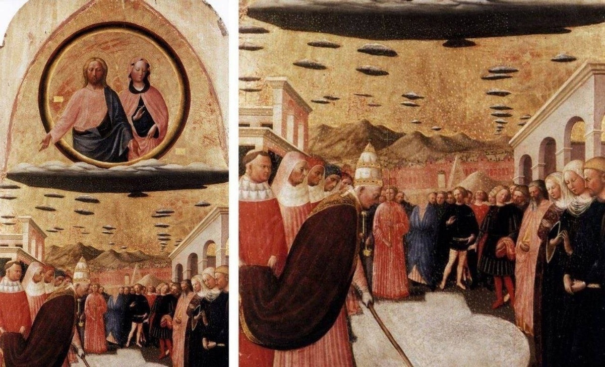 На картине «Чудо снега» художника Мазолино да Паникале изображено событие, происшедшее в Риме в IV веке, когда в жаркий августовский день неожиданно пошел снег Иисус и Мария, сидящие на облаке, наблюдают за горожанами. Все небо усеяно дисковидными предметами. Исследователи сходятся во мнении, что художник не стал бы изображать облака столь примитивным образом, так как остальные детали на картине прописаны очень тщательно. Стоит отметить, что на остальных своих картинах Мазолино всегда изображал облака реалистично. Терра инкогнита | Неизвестная земля