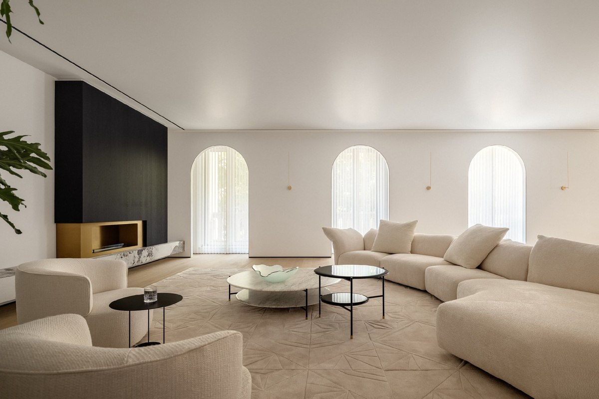 Архитектурная студия Y&J Design в Шанхае объединила три виллы в просторный семейный дом, наполненный искусством, который сочетает в себе грандиозность и интимность. Основатель студии Лю Хун описывает этот проект как «испытание креативности и стойкости», сравнивая его с персонализацией отеля. «Владельцы — молодая пара, увлеченная музыкой и искусством. У них есть дети, которым нужно много пространства для учёбы», — говорит Хун. Несмотря на масштаб, задача была проста: «Мы хотели решить все функции с минимальным количеством материалов, оставив большую белую площадь как холст для искусства и света». Дизайн включает вертикальное зонирование для интеграции архитектуры и интерьеров, а также для связи визуальных и аудиальных искусств с внутренними переживаниями. «Духовность так же важна, как и физическая жизнь», — добавляет он. Проект начинается с двух подземных этажей, где расположены зоны для развлечений, спортзал, детская площадка, аудиовизуальная комната и винный погреб. Связующим элементо