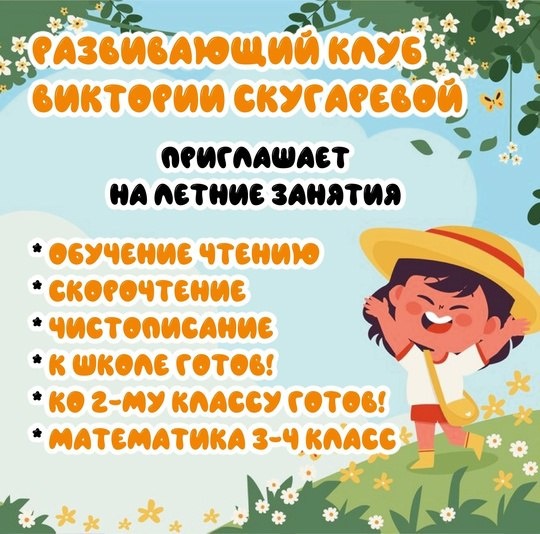 Приглашаем ребят на летние занятия в развивающий клуб 🤗 Узнать подробнее и посмотреть видео можно в нашей группе 👇 [|Развивающий клуб Виктории Скугаревой] Подписывайся, чтобы не пропускать новости❤ 📌С 1 июня меняется стоимость занятий (Подробнее [|здесь]) Но для тех, кто начнëт ходить на занятия в мае, есть возможность оплатить месяц по старым ценам 😉 Чтобы записаться, напишите на ватсап +79521722097 📨 Занимаемся в г.Гурьевск, ул. 30 лет Победы, д.64 🏡
