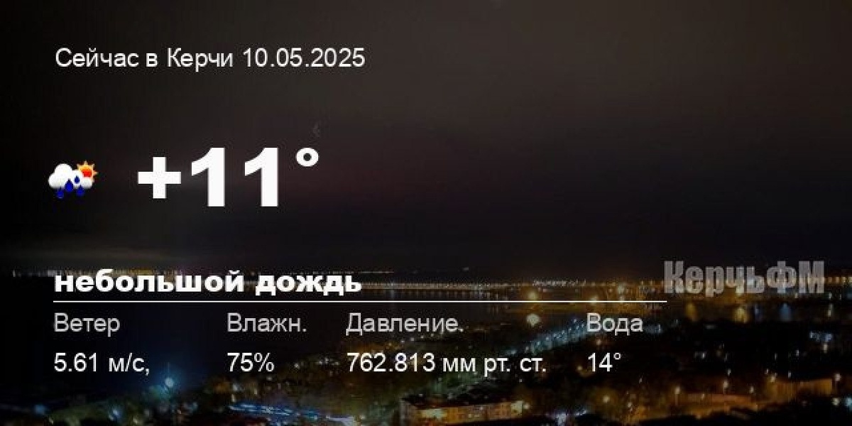 Сегодня днем в Керчи, 10 мая, ожидается небольшой дождь, температура воздуха от +11° до +13°С, ветер 5.66 м/с, порывы до 9.09 м/с, давление 762.8 мм рт. ст., влажность 73%.