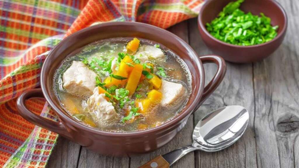 - Полученную смесь выливаем в бульон, одновременно его помешиваем. Только спешить не будем, чтобы не получились комки. За минуту до снятия с огня добавим в суп уксус и молотый перец.