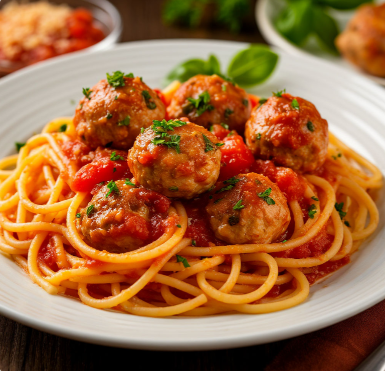 Приготовим вкусные спагетти с куриными фрикадельками в томатном соусе – классическое итальянское блюдо, которое любят и дети, и взрослые! Для начала приготовим фрикадельки: берем 600 г куриного фарша. Добавляем в фарш соль, перец и смесь трав по вкусу (например, итальянские травы). Тщательно перемешиваем фарш. Формируем из фарша небольшие фрикадельки. В кастрюле или глубокой сковороде разогреваем немного растительного масла. Обжариваем фрикадельки со всех сторон до золотистой корочки. Пока обжариваются фрикадельки, приготовим соус: одну репчатую луковицу и одну морковь очищаем и мелко нарезаем. 2-3 стебля сельдерея нарезаем небольшими кусочками. Один сладкий перец (лучше красного или желтого цвета) очищаем от семян и нарезаем кубиками. 2-3 зубчика чеснока очищаем и измельчаем. К обжаренным фрикаделькам добавляем нарезанный лук и обжариваем до мягкости. Добавляем морковь, сельдерей, сладкий перец и чеснок, обжариваем овощи несколько минут. Открываем банку помидоров в собственном соку (ц