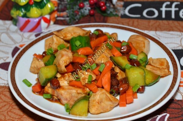 Курица с арахисом и овощами От автора: Курица с арахисом и овощами - это китайская кухня. Она на любителя, но красного перца можно добавлять по вкусу, а не так, как добавляют в Китае, что кушать не возможно от остроты. Ингредиенты: Морковь - 130 гр. Орехи арахис - 60 гр. Куриная грудка - 400 гр. Огурцы свежие - 170 гр. Соус соевый - 80 мл. (4 ст. л.) Крахмал картофельный - 30 гр. (1 ст. л.) Сахар - 25 гр. (1 ст. л.) Перец красный молотый - 1 гр. (по вкусу) Масло растительное - 30 мл. (для жарки) Источник: https://rusdinner.ru/page/kuritsa-s-arahisom-i-ovoshhami