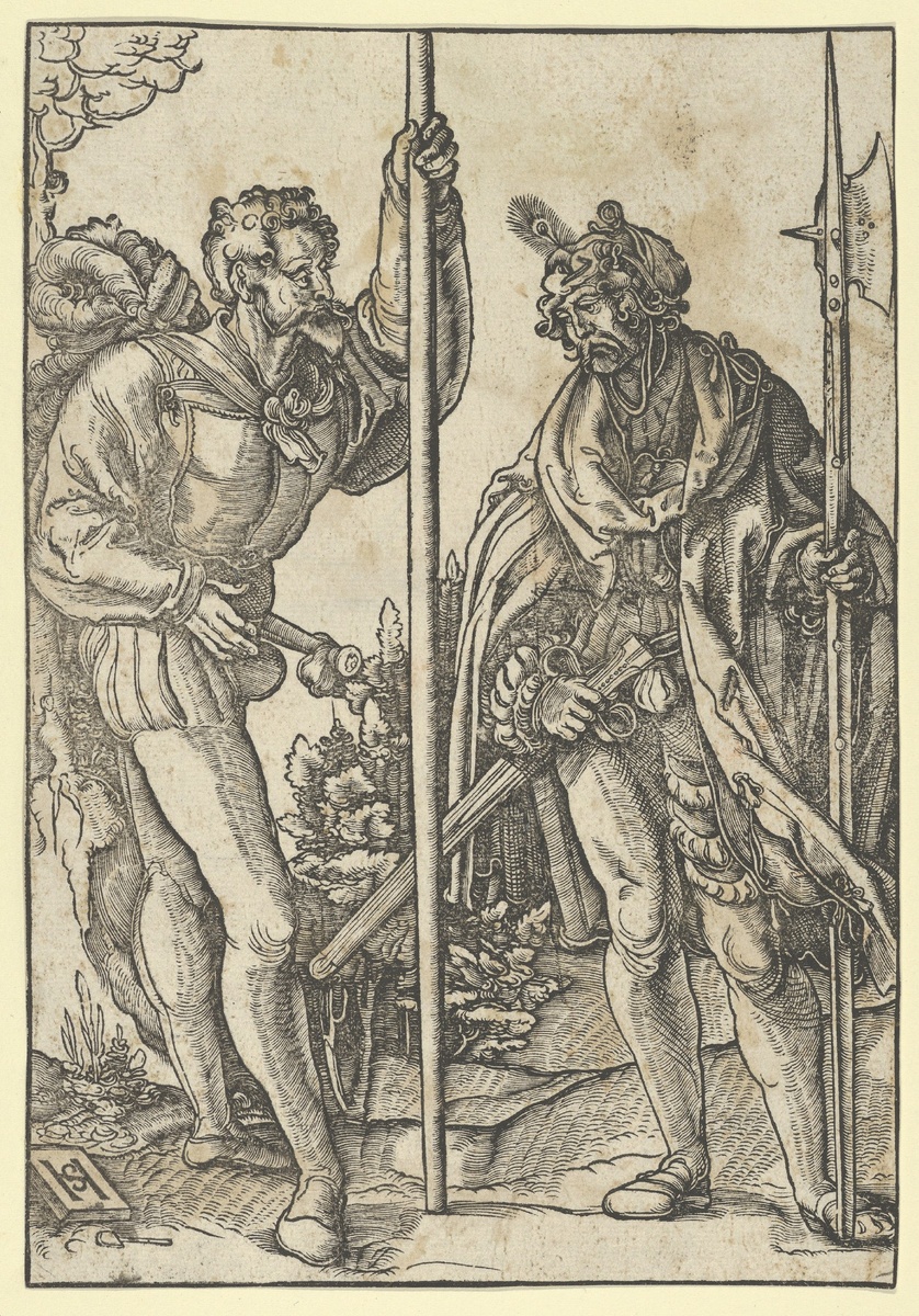 На первом плане гравюры «Two Soldiers with Lance and Halberd Conversing» два воина обсуждают нечто более важное, чем просто сражение. Их позы полны напряженной уверенности, а глаза сверкают как драгоценные камни, наполненные историями и тайнами. Эта работа Ханса Шойфелайна, созданная с невероятной точностью, погружает зрителя в мир, где каждое слово может определить судьбу.