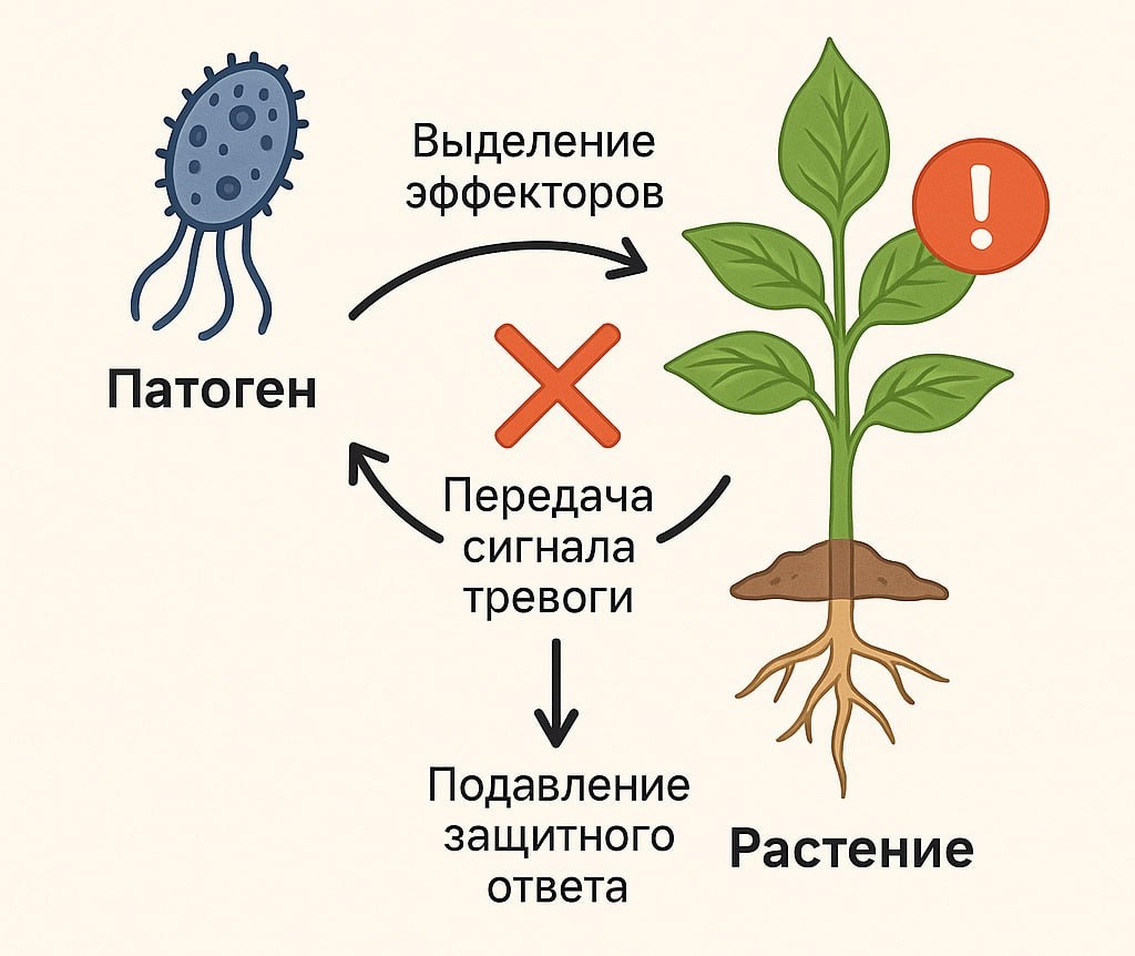 Растения имеют свою «иммунную систему» — сигнальные пути, которые активируются при контакте с патогеном. Но многие возбудители научились вмешиваться в эти сигналы, подавляя защитные реакции на молекулярном уровне.