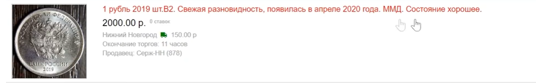Друзья, всем привет. Зашёл я на один сайт, это аукцион, не буду называть какой, чтобы не рекламировать. И вы видите, 1 рубль 2019-го года, эта разновидность появилась в апреле 2020-го года. Состояние монеты хорошее, чеканилась она Московским монетным двором. Посмотрите на её стоимость - 2 000 рублей. Представляете? 1 рубль 2019-го года, начальная ставка 2 000 рублей! Вот еще, на этом же аукционе, 1 рубль 2019-го года с начальной ставкой 239 рублей и с указанием блиц цены в 250 рублей. Для тех, кто не знает, блиц цена эта сумма, которую вы можете уплатить и выкупить сразу монету. Вы видите, какие цены? Это свидетельствует о том, что эти монеты далее будут стоить ещё больше. Вот еще подтверждение. 1 рубль 2019 года и блиц цена монеты 499 рублей. Вы представляете? То есть 1 рубль стоит 500 рублей! И давайте, друзья, мы сегодня рассмотрим, как распознать именно дорогую. 1 рубль 2019 года чеканили на Московском монетном дворе в трёх разновидностях. Две из них обычные разновидности, а т