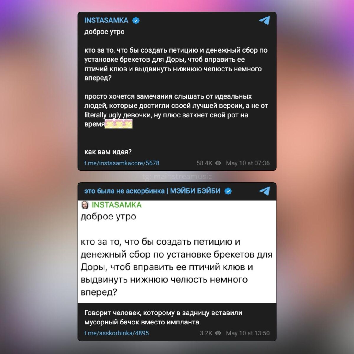 ⚡🤬 🤢 «Ну это плюс конфликт. Ты уже докинула лишнего». Стрим Доры и Бустера продолжает набирать обороты На стриме Доре задали неудобный вопрос про артистов, от которых плохо пахнет. Дора попыталась на него ответить честно: назвала тиктокершу Машу Горячеву — и в итоге словила волну хейта в свою сторону. Заступилась на Марию Горячеву сегодня с утра INSTASAMKA, а за Дору вступилась Мэйби Бэйби. Тиктокерша вчера тоже прокомментировала эту ситуацию: «Очень странно, что девочка унизила девочку, можно было как-то свернуть жёсткость этого вопроса, или добавить, что у всех бывает, ничего страшного... Дора, у меня нет к тебе вопросов, реально, пожалуйста, сказала и сказала». ❤️ — девчонки, давайте жить дружно! @mainstreamusic