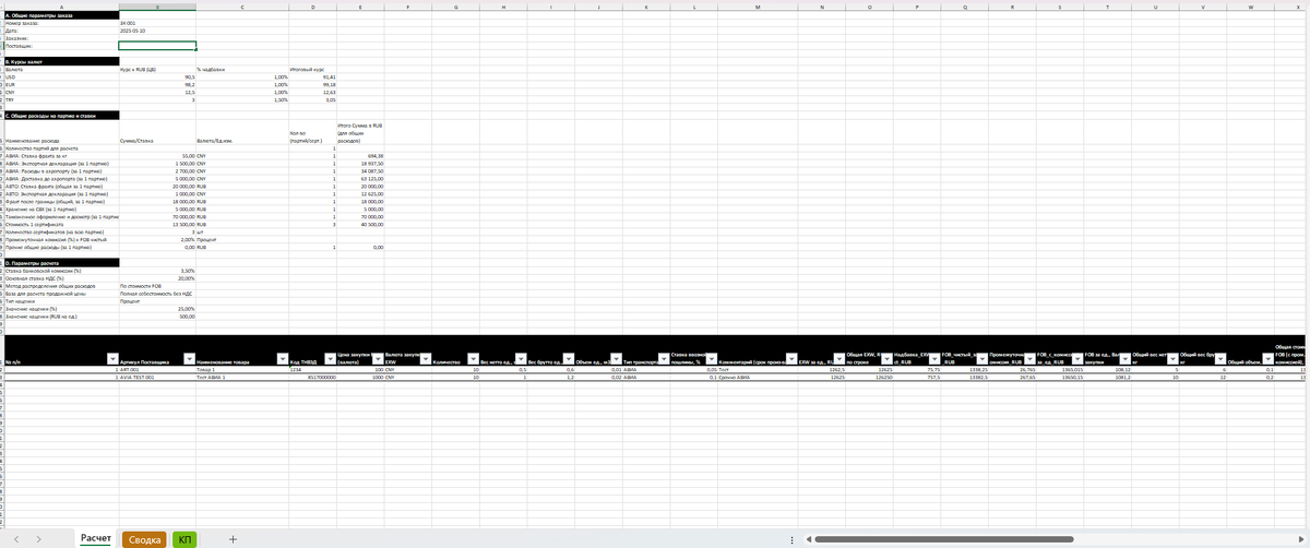 Привет, предприниматели, менеджеры по закупкам и все, кто хоть раз сталкивался с головной болью расчета полной себестоимости товаров, особенно при импорте! Знакома ситуация: курс скачет, транспортные расходы многосоставные, таможня со своими сюрпризами, а еще куча мелких затрат, которые так легко упустить? В итоге – цена продажи назначена "на глазок", а реальная прибыль оказывается совсем не той, на которую рассчитывали. Или еще хуже – работаем в минус, сами того не подозревая! Представляем Решение! Хватит это терпеть! Мы разработали мощный, но интуитивно понятный Excel-инструмент, который автоматизирует весь процесс расчета – от цены закупки у поставщика до итоговой прибыли по каждой позиции и всему заказу. И да, он учитывает и АВИА, и АВТО доставку! Что умеет наш "Калькулятор Мечты"?