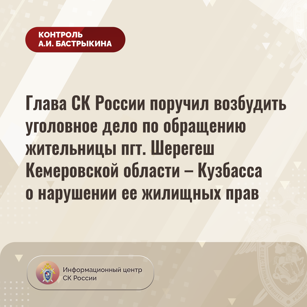Глава СК России поручил возбудить уголовное дело по обращению жительницы пгт. Шерегеш Кемеровской области – Кузбасса о нарушении ее жилищных прав В комментариях в аккаунте приёмной Председателя СК России А.И. Бастрыкина «ВКонтакте» размещено обращение жительницы Кемеровской области – Кузбасса по вопросу нарушения ее прав. Многоквартирный дом на улице Веры Волошиной в поселке городского типа Шерегеш в 2022 году в связи со значительным физическим износом конструкций признан аварийным. Однако до настоящего времени благоустроенное жилье женщине не предоставлено. Многочисленные обращения результатов не принесли. Ситуация освещалась в СМИ и социальной сети. В СУ СК России по Кемеровской области – Кузбассу по доводам комментария начата процессуальная проверка. Председатель Следственного комитета Российской Федерации Александр Иванович Бастрыкин поручил руководителю СУ СК России по Кемеровской области-Кузбассу Александру Сергеевичу Безукладникову возбудить уголовное дело и доложить о ходе и р