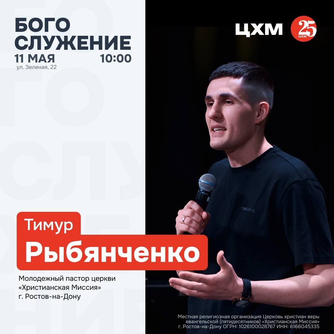 БОГОСЛУЖЕНИЕ 11 МАЯ В 10:00 ⛪️ Приходите на встречу с Господом, провести время в молитве, единстве и общении Богослужение проведет Тимур Рыбянченко молодёжный пастор церкви «Христианская Миссия» г. Ростов-на-Дону✨ Обязательно запланируй это время, ведь Господь ждет и готовит важное Слово! до служения проходит молитва в 9:30 ждем вас «Шесть дней ешь пресный хлеб, а на седьмой день проведи собрание Господу, твоему Богу, и не делай никакой работы.» Второзаконие 16:8 НРП Благословляем вас и приглашаем на богослужение! Адрес: Зеленая 22 🖥 ВКонтакте «Цхм Ростов» трансляция служения — https://vk.com/cxm.rostov 🖥 РУТУБ «Цхм Ростов» трансляция служения — https://rutube.ru/channel/39499224/ 🖥️ YouTube «Цхм Ростов» трансляция служения - https://youtube.com/@cxmrostov?si=gSKP3_oMbfVza0gg