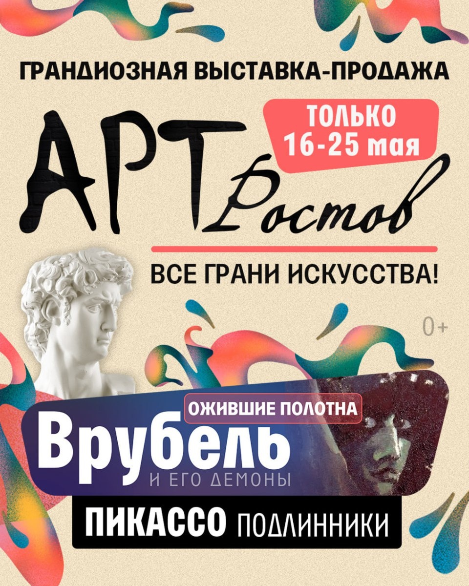 Выставка искусства «АРТ-РОСТОВ» с 16 по 25 мая! Более 300 талантливых художников, мастеров и галеристов со всей страны представят свыше 2000 произведений живописи, графики, скульптуры, фотографии и арт-объектов. 🎨 Впервые в Ростове-на-Дону мультимедийная выставка «Врубель и его демоны»! 🌟 Экспозиция «Пабло Пикассо. Параграфы» — 60+ литографий из частных коллекций Германии, Бельгии и Франции. 🇩🇪🇧🇪🇫🇷 На протяжении 10 дней мастер-классы, флэшмобы, литературные чтения, захватывающие перфомансы, музыкальная программа и розыгрыши призов! 🎭 📅 16 - 24 мая с 11.00 до 20.00, 25 мая с 11.00 до 18.00 📍 "ДонЭкспоцентр", пр. М. Нагибина, 30 #яместный