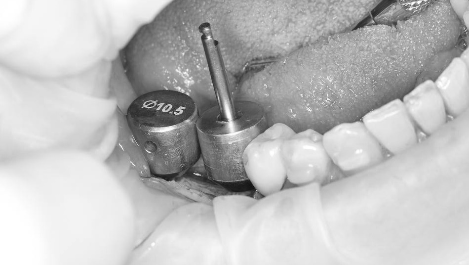 В первой части я рассказывал про всевозможные на данный моменты способы установки имплантата. В этой статье хочу рассказать про то как на данный момент я ставлю имплантаты при имплантации 3-х и > «титановых друзей». Один-два имплантата я могу установить с позиционерами как на этой фотографии: Но когда требуется бОльшая точность, тогда прибегаем к планированию и изготовлению индивидуальных хирургических шаблонов. Хочу отметить важный момент, что правильная установка имплантата и последующего безгеморройного беспроблемного протезирования идёт из правильного планирования. А именно следует отталкиваться где будут в дальнейшем новые зубы (коронки). По плану необходимо установить 5 имплантатов на верхней челюсти: Выполнили сканирование и сделали кт снимок, для того, чтобы в программе можно было всё визуально смоделировать и определить оптимальное положение имплантатов. Напечатали шаблон: И чтобы сверло шло точно по заданному направлению и без люфта при сверлении использовали дополнительны