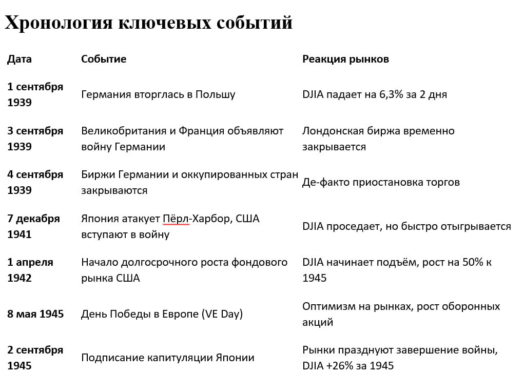 История Второй мировой войны показывает, что фондовые рынки не живут только страхами и паникой. Они живут ожиданием. Даже в самые тёмные времена инвесторы верят в восстановление, мир и рост. Компании, адаптировавшиеся к новым условиям — прежде всего производственные и оборонные — не просто выжили, а стали новыми гигантами послевоенного мира